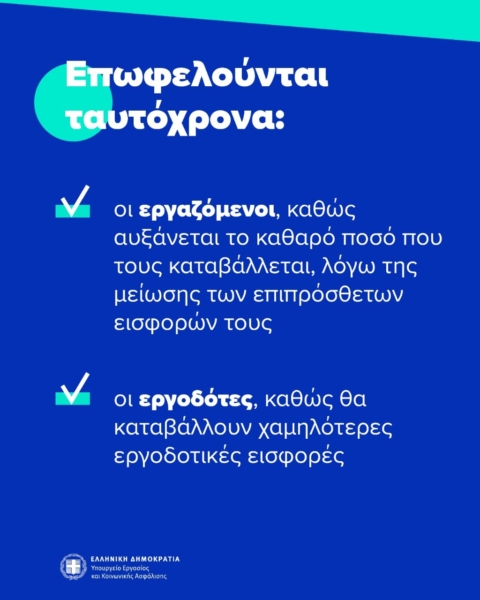 Στην περαιτέρω ελάφρυνση του μη μισθολογικού κόστους, με όφελος για εργαζόμενους και επιχειρήσεις, προχωρά το Υπουργείο Εργασίας και Κοινωνικής Ασφάλισης.