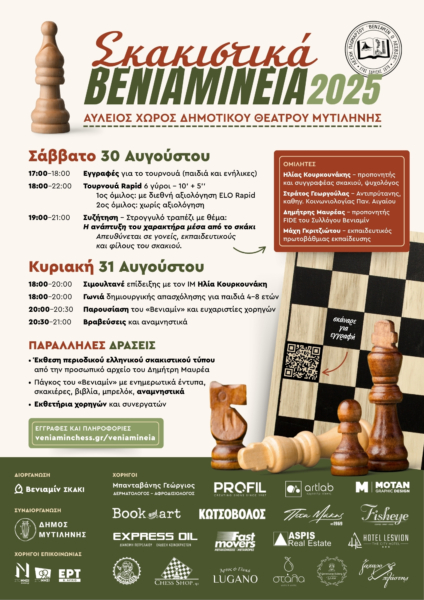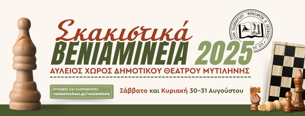 Η Λέσχη Πλωμαρίου «Βενιαμίν ο Λέσβιος» σας προσκαλεί σε ένα διήμερο γεμάτο παιχνίδι, γνώση και συμμετοχή – για παιδιά, ενήλικες, γονείς και φίλους του σκακιού!