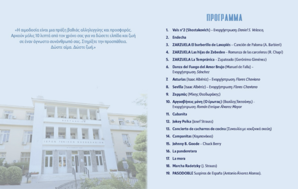 Παράλληλα με τη συναυλία, θα πραγματοποιείται εθελοντική αιμοδοσία στον χώρο του Νοσοκομείου, λόγω της αυξημένης ανάγκης για αίμα. Σας καλούμε να συμμετάσχετε σε αυτή την πράξη ζωής, στηρίζοντας τους συνανθρώπους μας που το έχουν ανάγκη.