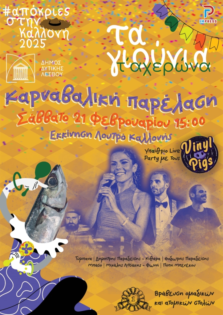 Το Σάββατο 21 Φεβρουαρίου 2026 τα αυθεντικά έθιμα της λεσβιακής Αποκριάς αναβιώνουν μέσα από μια γιορτή που συνδυάζει τη λαϊκή παράδοση με τον σύγχρονο σατιρικό σχολιασμό της επικαιρότητας.