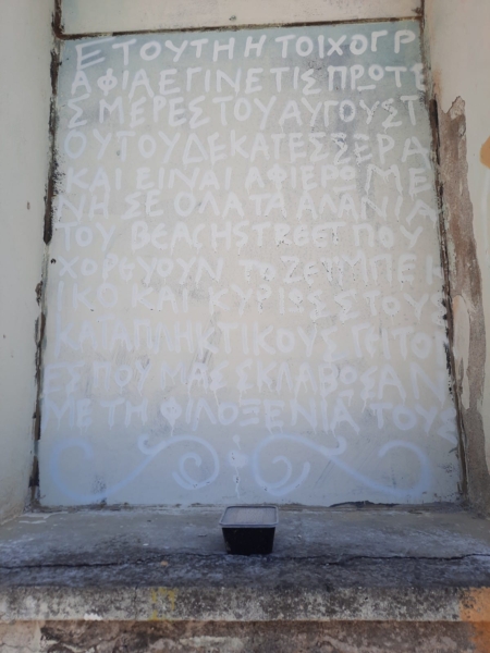 Χθες είχαμε μία καταγγελία από γείτονες που μένουν στην περιοχή του λιμανιού, ότι μέλη της ΚΝΕ έσβησαν τα γκράφιτι που είχανε κάνει μέλη της Σχολής Καλών Τεχνών το 2014.