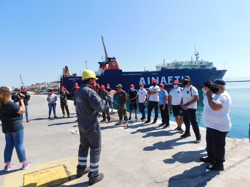 Το πρόγραμμα λόγω των έκτακτων μέτρων προστασίας της δημόσιας υγείας από τη διασπορά του κορωνοϊού COVID-19 προσαρμόστηκε ανάλογα. Από 09.30 έως 11.00 έγινε αναλυτική παρουσίαση του εξοπλισμού αντιμετώπισης περιστατικών ρύπανσης από πετρέλαιο που διαθέτει το Λιμενικό Ταμείο στον λιμένα Μυτιλήνης, περιγράφηκαν οι διαδικασίες χρήσης των πλωτών φραγμάτων με έμφαση στην αγκυροβόλησή τους, οι διαδικασίες χρήσης και τα κριτήρια επιλογής των απορροφητικών και προσροφητικών υλικών και πραγματοποιήθηκε επίδειξη λειτουργίας του νέου συστήματος περισυλλογής πετρελαιοειδών (skimmer). Στη συνέχεια ακολούθησε η διεξαγωγή άσκησης κατά την οποία η ομάδα κλήθηκε να αντιμετωπίσει περιστατικό διαρροής πετρελαίου στον εσωτερικό λιμένα με χρήση πλωτού φράγματος και αγκυροβόλησή του.