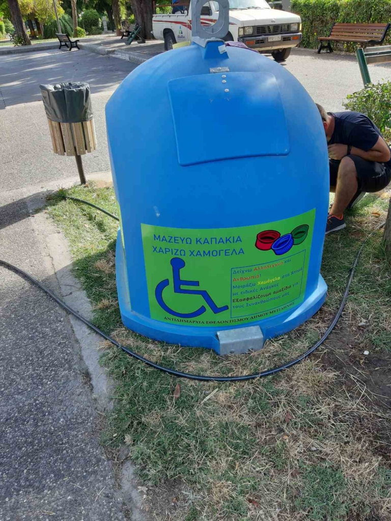 Σήμερα 03/08/2021 στο πάρκο της Αγίας Ειρήνης (δίπλα στην παιδική χαρά) ως Αντιδημαρχία Καθαριότητας του Δήμου Μυτιλήνης τοποθετήσαμε ένα γαλάζιο κώδωνα για να συλλέξουμε καπάκια.