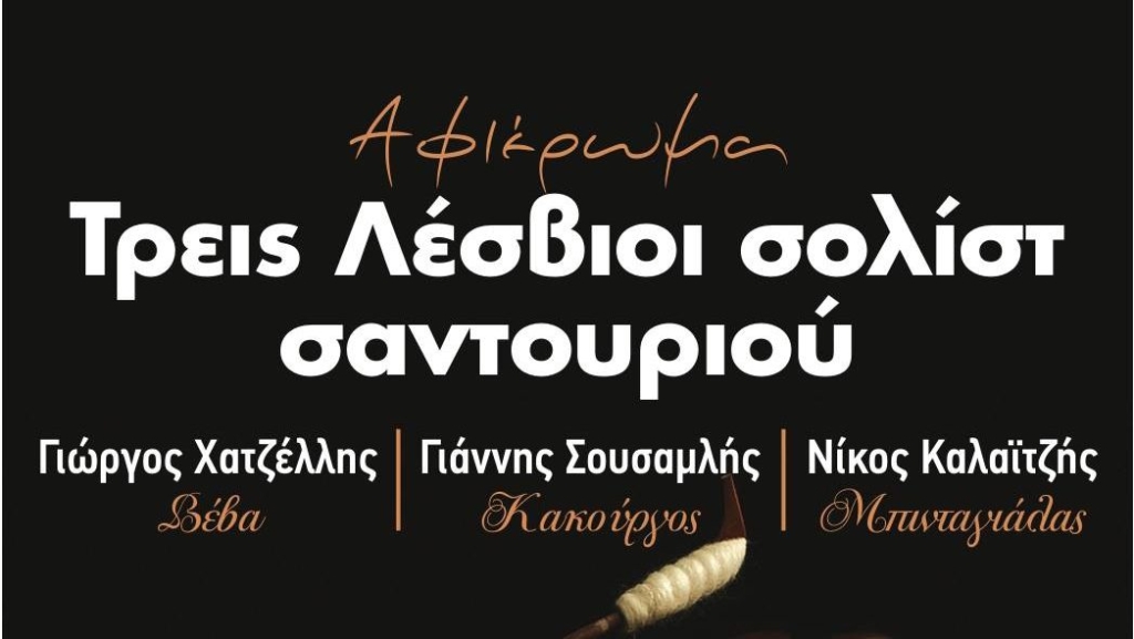 Eκδήλωση με θέμα «Τρείς Λέσβιοι Σολίστ Σαντουριού», με συνδιοργανωτές την Εφορεία Αρχαιοτήτων Λέσβου, το Μουσικό Σχολείο Μυτιλήνης και τους Φίλους Ιστορικής Μνήμης κ’ Πολιτιστικής Δημιουργίας, θα πραγματοποιηθεί την Δευτέρα 2 Ιουνίου 8.μ.μ, στον αύλειο χώρο των Αποθηκών Σαπλιτζά του Κάτω Κάστρου Μυτιλήνης.