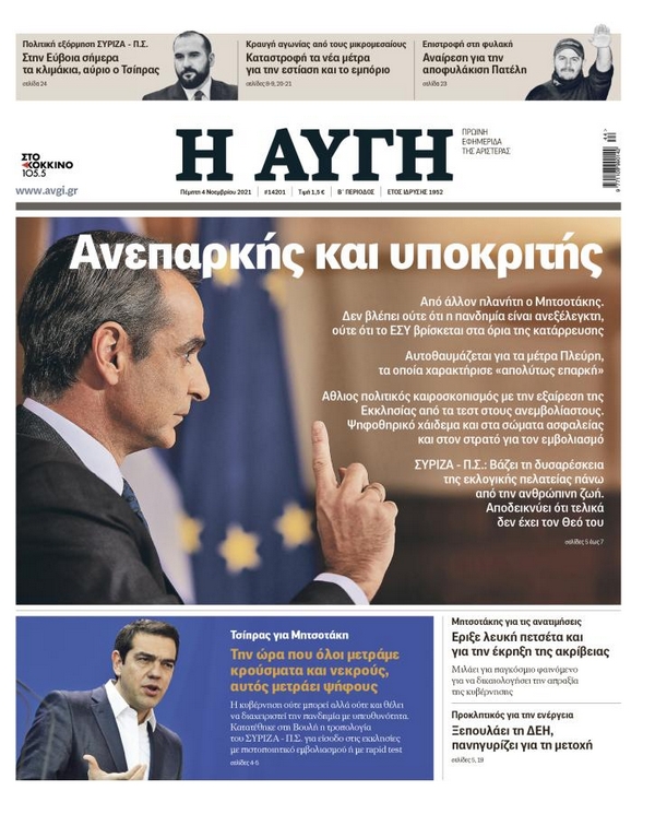 – Κυκλοφόρησε σήμερα η ΑΥΓΗ με πρωτοσέλιδη φωτογραφία του Κυριάκου Μητσοτάκη και κάπου χαμηλά χώρισε και η φώτο του Αλέξη Τσίπρα! Μπορεί να είχε τίτλο για τον Πρωθυπουργό «Ανεπαρκής και Υποκριτής» (καλά εκεί δεν διαβάζουν δημοσκοπήσεις;), αλλά επικοινωνιακά αυτό ονομάζεται αυτογκόλ. Μας πειράζει εμάς; Όχι καθόλου, να συνεχίσουν έτσι…