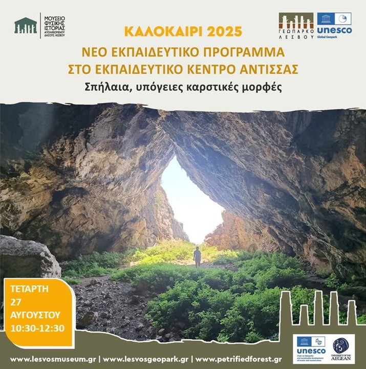 Το Εκπαιδευτικό Κέντρο Άντισσας προσκαλεί μικρούς και μεγάλους σε ένα συναρπαστικό βιωματικό πρόγραμμα με θέμα «Σπήλαια, υπόγειες καρστικές μορφές», το οποίο θα πραγματοποιηθεί την Τετάρτη 27 Αυγούστου και ώρες 10:30-12:30 στο Εκπαιδευτικό Κέντρο Άντισσας