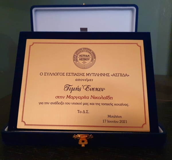 Ο Σύλλογος Εστίασης Μυτιλήνης «ΑΣΠΙΔΑ» βράβευσε την νικήτρια του MASTER CHEF Μαργαρίτα Νικολαϊδη για την ανάδειξη του νησιού μας και της τοπικής κουζίνας μέσω του τηλεοπτικού διαγωνισμού.