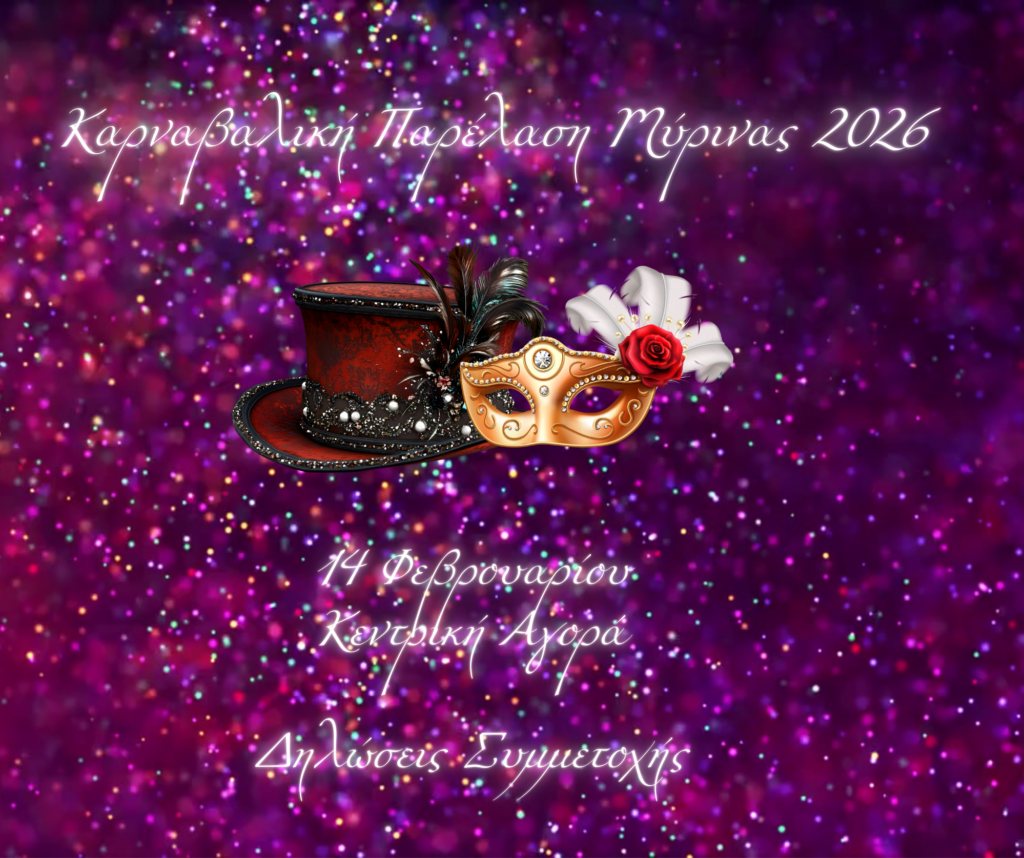 Ο Δήμος Λήμνου προσκαλεί συλλόγους, φορείς και ομάδες πολιτών να δηλώσουν συμμετοχή στην Καρναβαλική Παρέλαση της Μύρινας, που θα πραγματοποιηθεί το Σάββατο 14 Φεβρουαρίου 2026, τις πρωινές ώρες, στην Κεντρική Αγορά της πόλης.