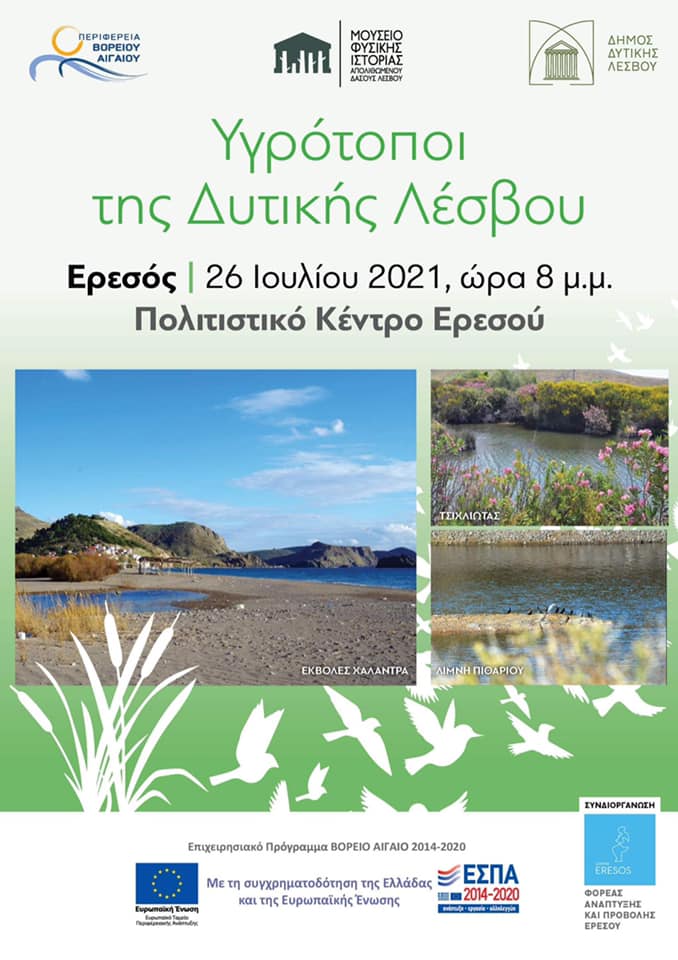 Η πρώτη εκδήλωση οργανωθεί σε συνεργασία με τον Φορέα Ανάπτυξης και Προβολής Ερεσού με θέμα «Υγρότοποι της Δυτικής Λέσβου» και θα πραγματοποιηθεί τη Δευτέρα 26 Ιουλίου 2021 και ώρα 8:00 μ.μ., στο Πολιτιστικό Κέντρο Σκάλας Ερεσού.